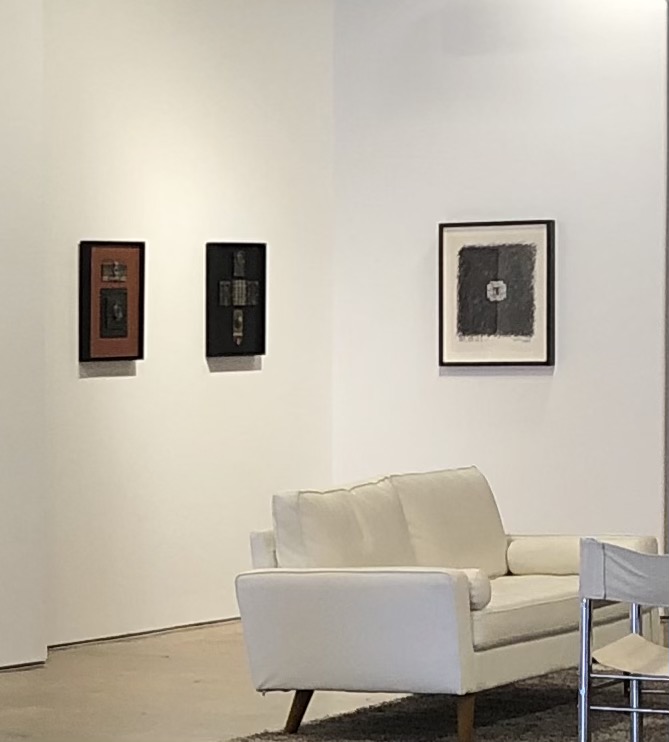 An initial glance at any exhibition establishes the sense of scale and spatial “timing”; for COLLAGE, the impression is of a dynamic relationship between the works and the architecture. Each piece is modest in size--the smallest only 3x3 inches within the frame. Even so, the total installation punctuates the perimeter with moments that range from intimate to monumental. One such episode concerns the “broken grid” of photographs stacked high on the gallery wall; this arrangement draws attention both down and up, in terms of space and perceived aesthetic value, by relating the art to the ghostly remnants of the original tiled factory floor.